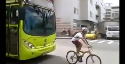 Pentru un motiv oarecare, Acest ciclist încearcă să irite conducătorul unui autobuz în Columbia. În cele din urmă devine ceea ce el merită.