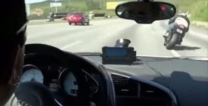 Un placaj foarte periculoase între un Audi R8 si doua motociclete (Suzuki GSXR1000 si Kawasaki Ninja ZX 10R) pe o autostrada din Brazilia.