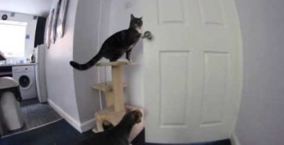 O pisică şi un câine încearcă să scape de bucătărie. Seful lor, Când el a fost lăsând pentru munca le lasă acolo pentru a face pagube, a constatat că au găsit o modalitate de a deschide [...]