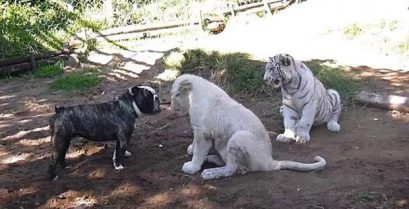 Hugo este un buldog engleză, care au crescut cu un tigru alb şi un leu alb în grădina zoologică din Parcul Seaview în Africa de Sud.