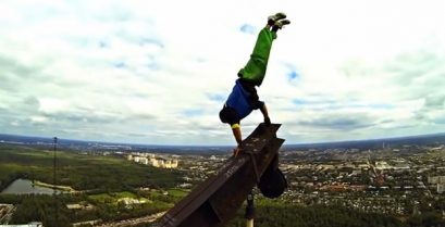 Alexander Rossinov face exerciții periculoase și acrobații pe acoperișuri și poduri, în oraşul de Saratov, Federaţia Rusă.