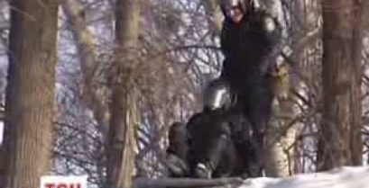 Cînd nu înăuntru folos să se confrunte cu protestatarii, membrii poliției ucrainene își folosesc scuturile ca sănii...