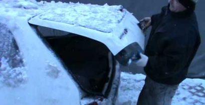 Un om în Polonia indeparteaza stratul gros de gheata peste masina lui.