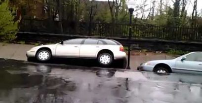 O bandă de pe strada East 26 Baltimore se prăbușește și alunecă sub un terasament după ploaie abundentă din 30 aprilie 2014.