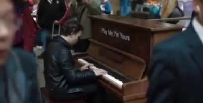 Henri Herbert, pianistul în banda de Jim Jones Revue, improvises pe un pian partajate, în sala principală de staţie de St. Pralea, Londra.