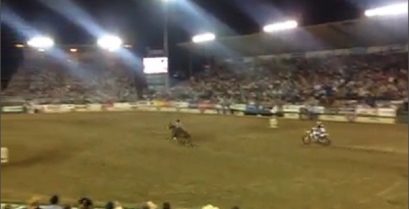 La un spectacol în Reno, Nevada, un cal de curse cu motocicleta într-o cursă. Cei doi călăreți trebuie să completeze rapid un traseu între 3 butoaie.