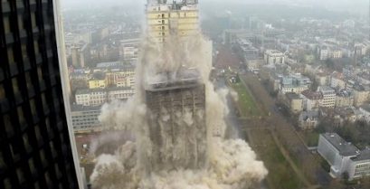 Experții în demolare folosesc aproape o tonă de explozibili pentru a exploda Turnul AFE de 116 de metri din Frankfurt, Germania.