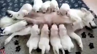 Zece pui nou-nascutilor sta lângă mama şi bea lapte lor.