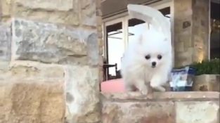 Accident amuzant de un Pomeranian în slow motion, încearcă să coboare scările. Câine aparţine actorul Asher Monroe publicat video. Pe twitter mai târziu, raportat că câine a fost rănit.