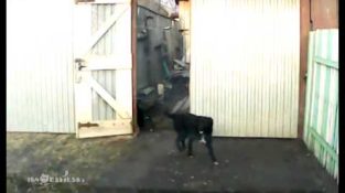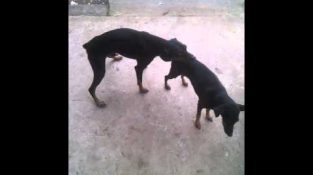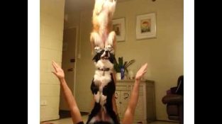 Border Collie Ace (alb-negru, 22 luni-vechi) şi Holly (roşu şi alb, 28 luni-vechi) scoate în evidenţă un truc incredibil de echilibrare cu lor proprietar. Poţi să crezi asta?
