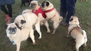 Patru caini Pug excitat prea o dată situate de-a lungul. Cunoștința este urmată de o dragoste ciudată... pătrat.
