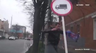 Amuzant scena în Krasnodar, Federaţia Rusă, cu un pieton ghinion să accepte în cap un semn după un accident minor între maşini. din fericire, Nu serios răniţi.