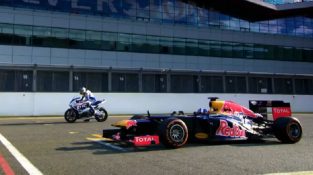 O Guy Martin cu Tyco BMW superbike curse a lui David Coulthard în Formula 1 Red Bull RB8, într-o cursă separat pe pista de Silverstone.