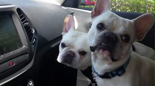Două mici Bulldog francez înnebuni de bucuria lor când proprietarul său spune el va merge în parc.