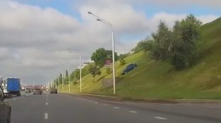 Într-un bulevard oraș Ufa în Rusia, o mașină fără șofer rostogolește în jos un deal și se ciocnește cu un camion și o dubă. Proprietarul masina a uitat se pare că pentru a aplica frâna de parcare.
