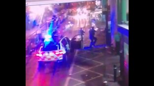 camera de securitate video, Acesta arată momentul în care poliția sosesc cu o mașină de poliție și a opri teroriști haos în London Bridge.