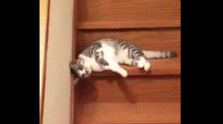 O pisica pare a fi foarte obosit din somnul de-a lungul zilei, așa că coboară scările casei... culcat.