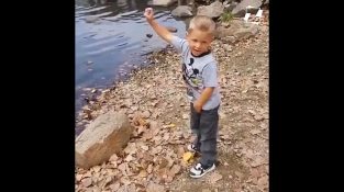 Un copil vrea să arunce o piatră în apă ca tatăl lui trage cu aparat de fotografiat. Semn fără cusur.