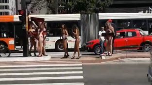 Un automobilist distras de fete în bikini, permanent cu bannere pe un trotuar Sao Paulo, Brazilia.