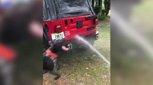 Un bărbat în Georgia din Statele Unite încearcă să spele Jeep său cu pneul, dar câinele său a găsit oportunitate pentru joc.