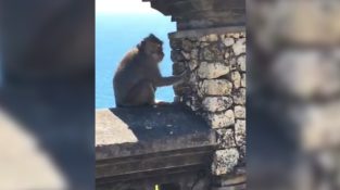 În Bali, Indonezia, un turist face greșeala de a trage un sine în fața unei maimuțe. Maimuța va fura telefonul și fugi.