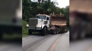 Un camion trage o remorcă cu un buldozer de 85 de tone, nu reușește să urce un deal.