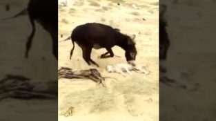 Într-o vale în Yemen, un măgar tocmai a ucis lupul apucat lui mai mic. cu furie, magarul păstrează lovind și musca cadavrul lupului mort.