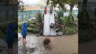 Copiii mici se joacă cu entuziasm excesiv într-un diapozitiv, în timpul ploii.