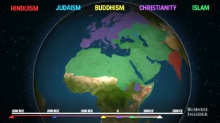 Această hartă 3D arată distribuţia de cinci religiile majore (Hinduismul, Budism, Creştinism, Iudaism și Islam) în jurul lumii în ultimii 5000 de ani.