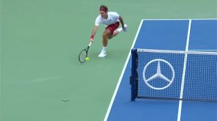 Roger Federer scoruri de necrezut un punct împotriva lui Nick Kyrgios, care trece mingea ușor lângă net.