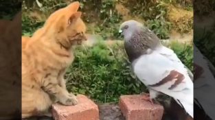 O pisică și un porumbel care au crescut împreună, se joacă între ei.