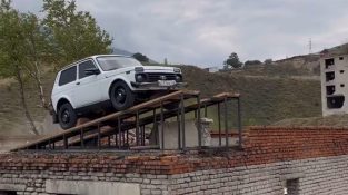 Test de sărituri de la clădire la clădire cu o Lada Niva în Rusia. Casdoria a eșuat, dar șoferul a coborât nevătămat din mașină.