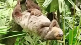 Prins cu picioarele pe trunchiul unui copac, un leneș doarme orizontal cu puiul întins și el pe burtă.
