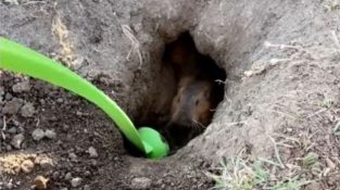 Un bărbat în Los Angeles, California, folosește un lansator de bile pentru a ajuta un geom să-și sapă gaura.