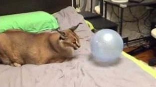 Un caracal pe un pat, are curiozitatea de a atinge un balon cu unghiile.