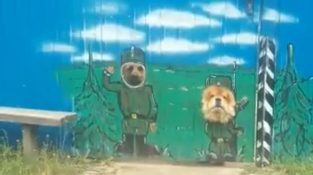 Proprietarul unei case a pictat pe gard două figuri foarte amuzante de soldați, și a deschis două găuri pentru capul câinilor săi.