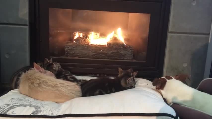 Собаки и кошки сидят у камина, когда их idioktitria, кричать, что это время еды.