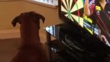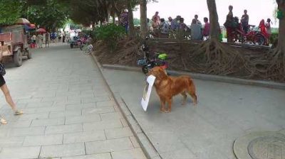 Мы увидели собаку, держащего знак для местного гамбургер сустава во время прогулки в деревне Хуанпу. Он будет ходить вверх и вниз пирса показывает знак для всех. Когда кто-то снимал, собака остановится и указать знак по отношению к ним. Так мило!