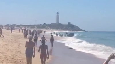 Субботы, 28 июля 2018 на пляже Захара де лос Atunes на юге Испании, около 50 иммигрантов прибыли с лодкой и начали работать на пляж среди туристов. Мы можем видеть, что некоторые туристы помогают мигрантам исчерпали. В проливе Гибралтар, на расстоянии 14 километров от Африки, становятся все более частыми перемещениями мигрантов. С начала года, более 20.000 иммигранты прибыли в Испанию.