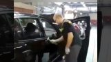 Магазин клерк в России будет противостоять человеку, который бьет пьяный. Женщина подошла и лежать его на землю с громким стуком.