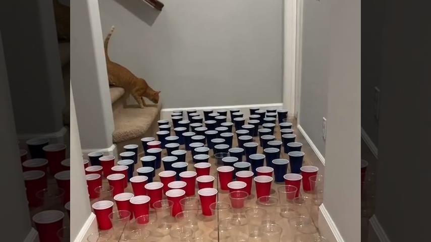 Как реагируют три разных кошки, когда по пути обнаруживают большое количество пластиковых стаканчиков.
