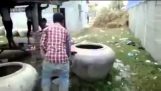 В страшной маске, маленький мальчик удивляет свою сестру.