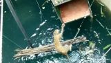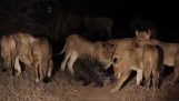 Храбрый черный барсук противостоит трем напавшим на него леопардам., Национальный парк Крюгера Южная Африка.