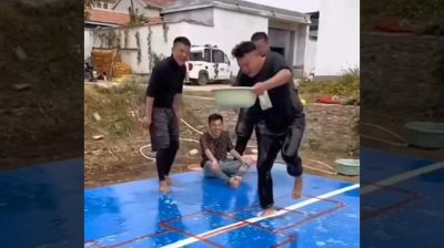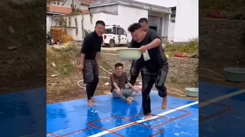 Группа друзей играет по разным правилам, на скользком пластиковом коврике. Игрок должен нести таз с водой и опорожнять его у ворот..