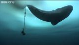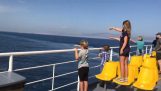 Посреди моря, женщина выходит из лодки, чтобы заняться сноркелингом. Но когда она ставит ноги в воду, появляется акула с широко открытым ртом. На самом деле, речь идет о тигровой акуле по имени «Королева Никки», которая чрезвычайно дружелюбна к людям и знает дайверов.. Просто пришел поздороваться.