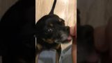 Теленок со странной окраской шерсти и его мать, они идут бок о бок.