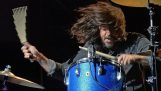 Мужчина в рыцарском шлеме играет на акустической гитаре песню AC/DC «Black in Black», в то время как женщина ударила его сковородкой по голове..