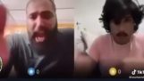 Немецкая овчарка нападает на маленькую собаку, Пока две другие собаки тянут своего владельца в бой.