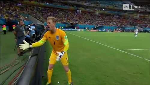 Англии вратарь Джо Харт призывает кричать мяч из менеджеров стадиона, После запуска фол в матче против Италии. Две минуты до конца матча и Англии из-за, Харт спешит выполнить быстро залпами для команды.