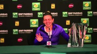 Посмотрите, как чемпионка BNP Paribas Open 2015 Симона Халеп пытается забрать свой трофей на пресс-конференции после своей последней победы.